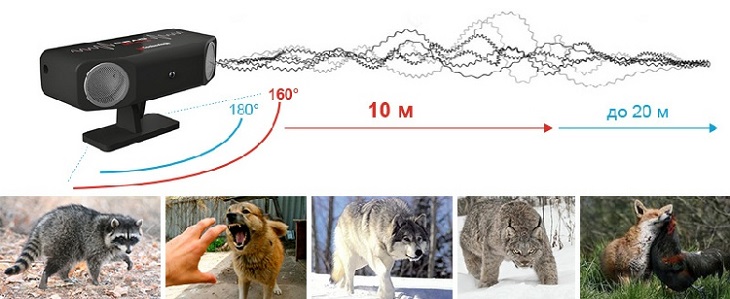 Прибор отпугивает собак, кошек и т.д. с расстояния не менее 10 метров, а животных с особенно острым слухом (например, лис) — с расстояния до 20 метров