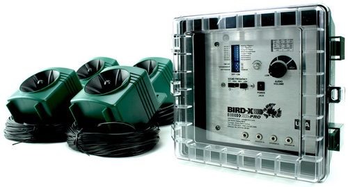 Звуковой и ультразвуковой (2 в 1) отпугиватель птиц "BroadBand PRO" является универсальным устройством, способным излучать как ультразвук, так и биоакустические сигналы (8 тревожных голосов птиц). Воздействие производится через четыре выносных громкоговорителя, настройка режимов (периодичность, повторение, громкость, тембр и пр.) производится со встроенного пульта. Корпуса блока управления и динамиков водозащищенные, покрываемая прибором площадь составляет 24000 м2. Питается устройство от сети или внешней батареи 12 В.